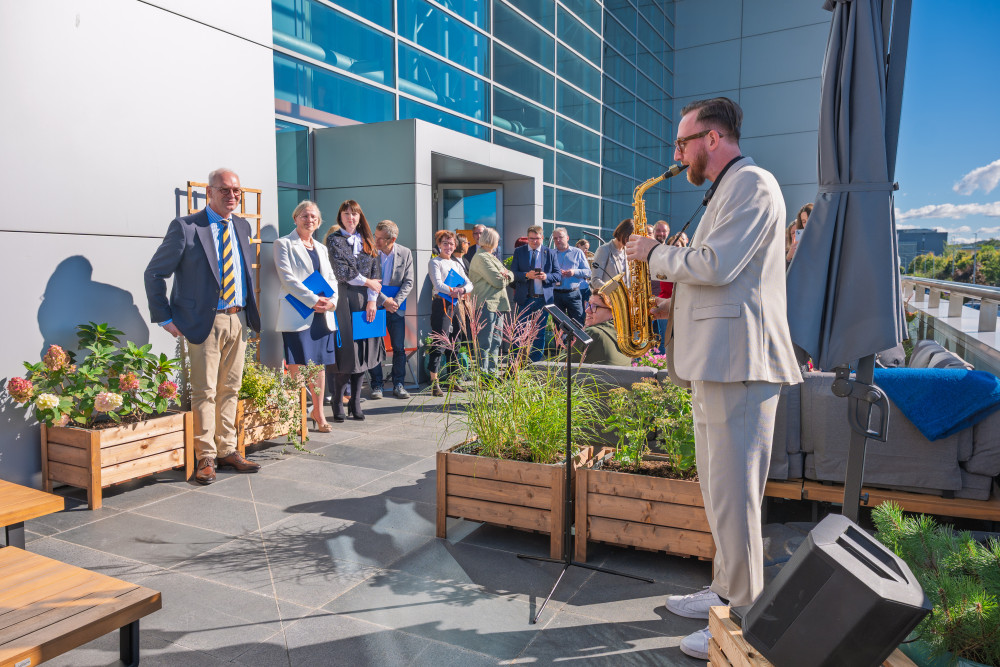 🔹 The second part of the meeting was the grand opening of the garden on the terrace of the Main Library. The new space was presented in an atmosphere full of warmth and kindness, and the event was graced by a performance by saxophonist Marcin Janek from the Gdańsk Academic Orchestra.